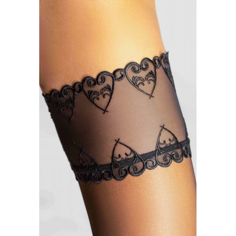 Ce bas nylon RHT 15 deniers sans couture allie pointe et talon diminués renforcés invisibles, sous-revers dentelle et jarretière en tulle brodé ton sur ton avec bandes silicone, pour un maintien parfait.