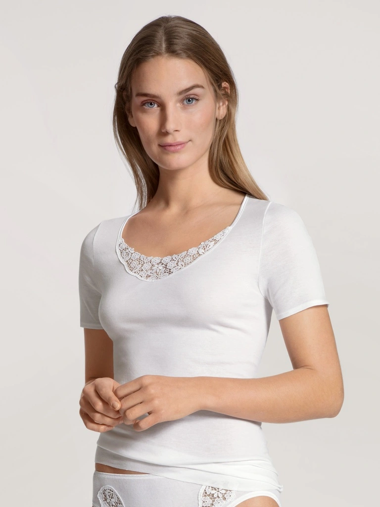 Une qualité hors ligne à enfiler. L’extraordinaire finesse de la nouvelle série basique FEMININ SENSE devrait vous séduire. Ce t-shirt à manches courtes est orné de dentelle de Saint-Gall haut de gamme sur son décolleté. Les hauts de la série FEMININ SENSE sont confectionnés avec des machines à tricoter circulaires spéciales, ce qui permet d’éviter les coutures latérales gênantes. Les ourlets ultra-plats et sans couture renforcent la sensation de confort jour après jour !