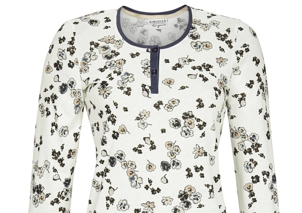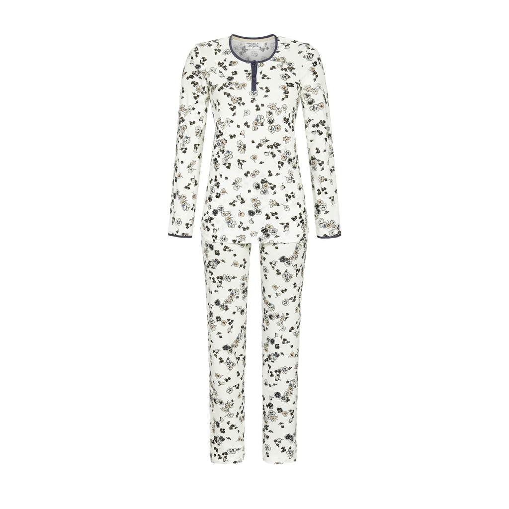 Ce joli pyjama montre le côté romantique. Le petit dessin floral est tout simplement magique. Avec une petite patte de boutonnage en contraste et de jolis boutons fleuris, le beau look est parfait. Un passepoil contrasté orne l’encolure et les ourlets des manches. L’ourlet est à la mode légèrement arrondi. Le pantalon a une taille élastique douce. Les pyjamas en mélange coton-modal fin sont particulièrement légers et doux pour la peau et impressionnent également par leur éclat de couleur durable.