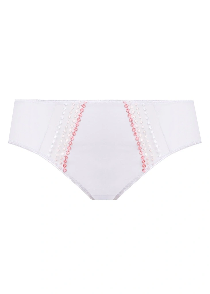 Le string Matilda en blanc présente un style contemporain doté d’une broderie en forme de perles posée par dessus des panneaux latérales transparents. Offrant une coupe moins couvrante, il est doublé sur l’avant et transparent au dos.
