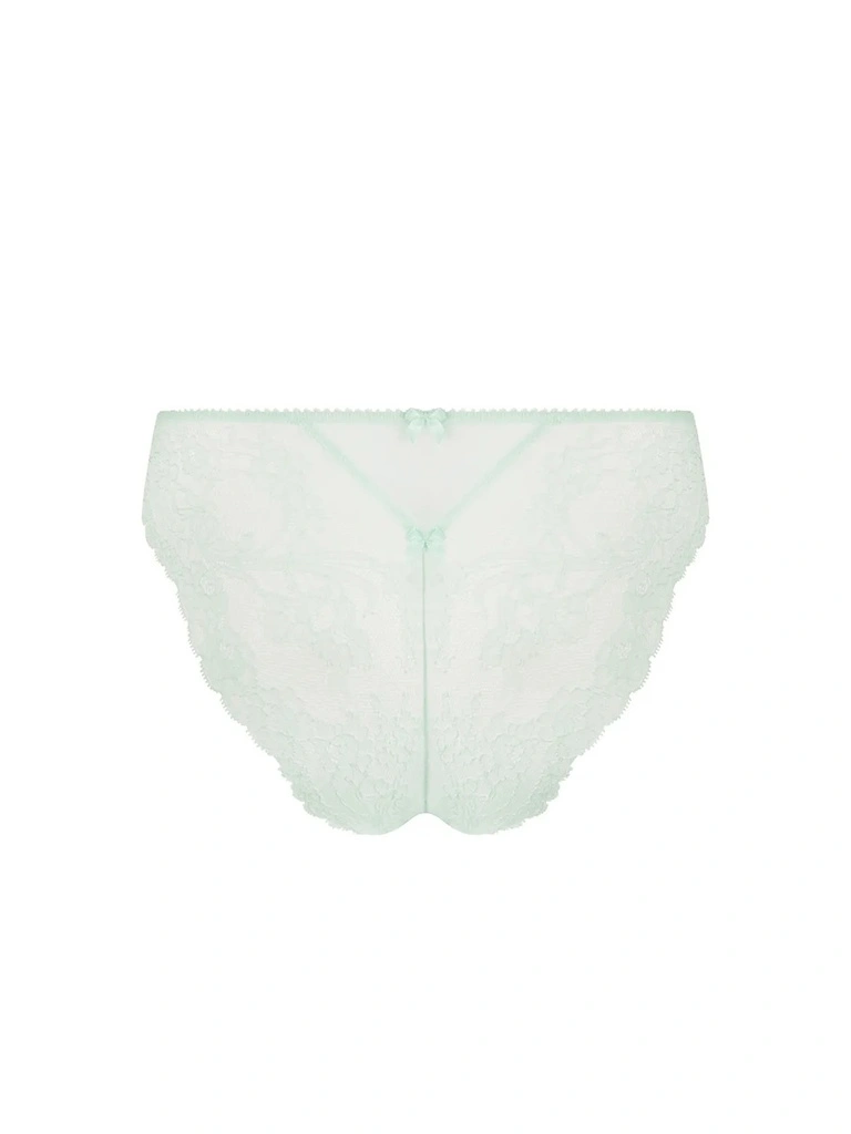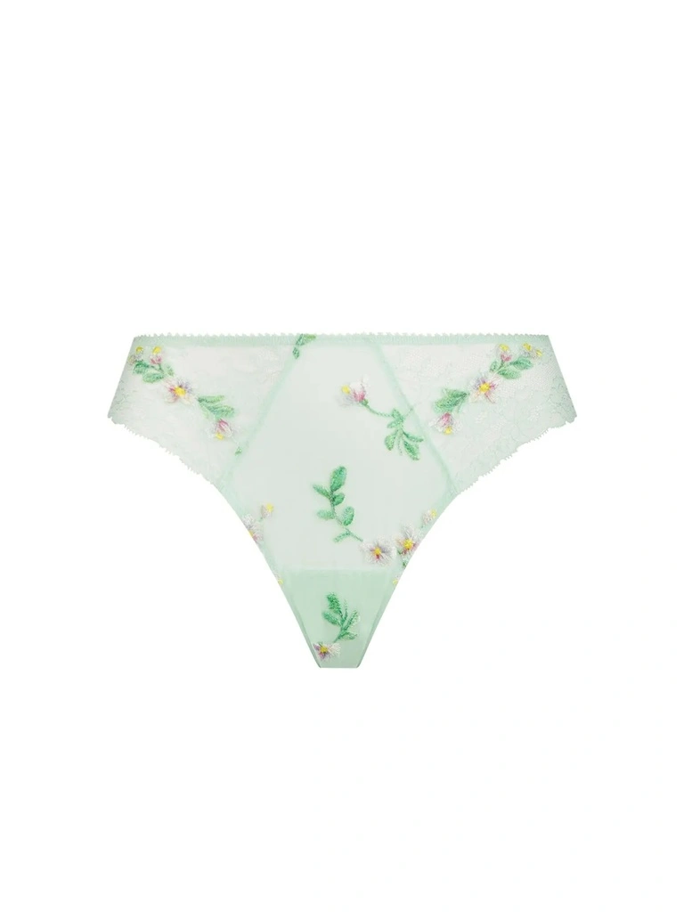 Tulle brodé multicolore sur devant et dentelle festonnée en empiècements devant et taille dos. Motif floral brodé sur taille côté . Tulle et petits nœuds au dos. Elastique fantaisie à la taille.