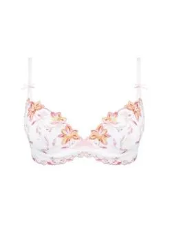 Bonnet en broderie multifils bayadère colorés, festonné au décolleté. La basque en tulle est enrichie d’une découpe en galon brodé festonné sur le côté du bonnet. Le bas de basque est habillé d’une petite bande brodée festonée. L’entre gorge est sublimé par un délicat laçage coloré terminé par un petit noeud. Les doubles bretelles sont agrémentées d’un petit noeud coloré au devant.