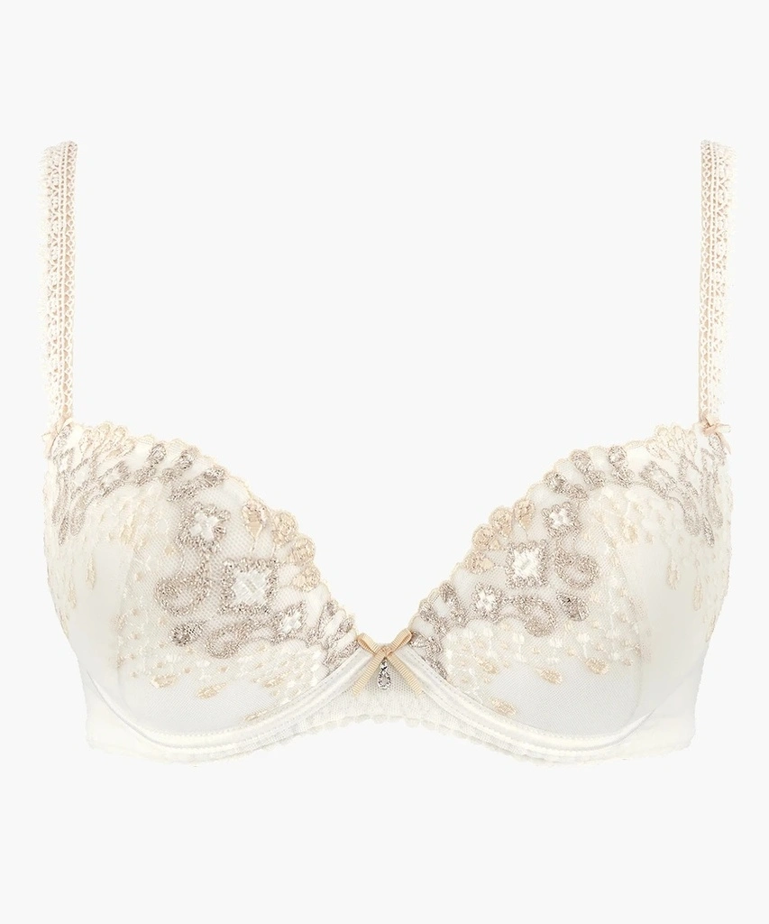 Le soutien-gorge push-up à coussinets amovibles Joyau Éternel offre un prodigieux décolleté plongeant révélant toute la sensualité de celle qui le porte. Sa broderie suisse parée de bijoux étincelants et ses bretelles en guipure ornementale subliment la création de glamour et de somptuosité.