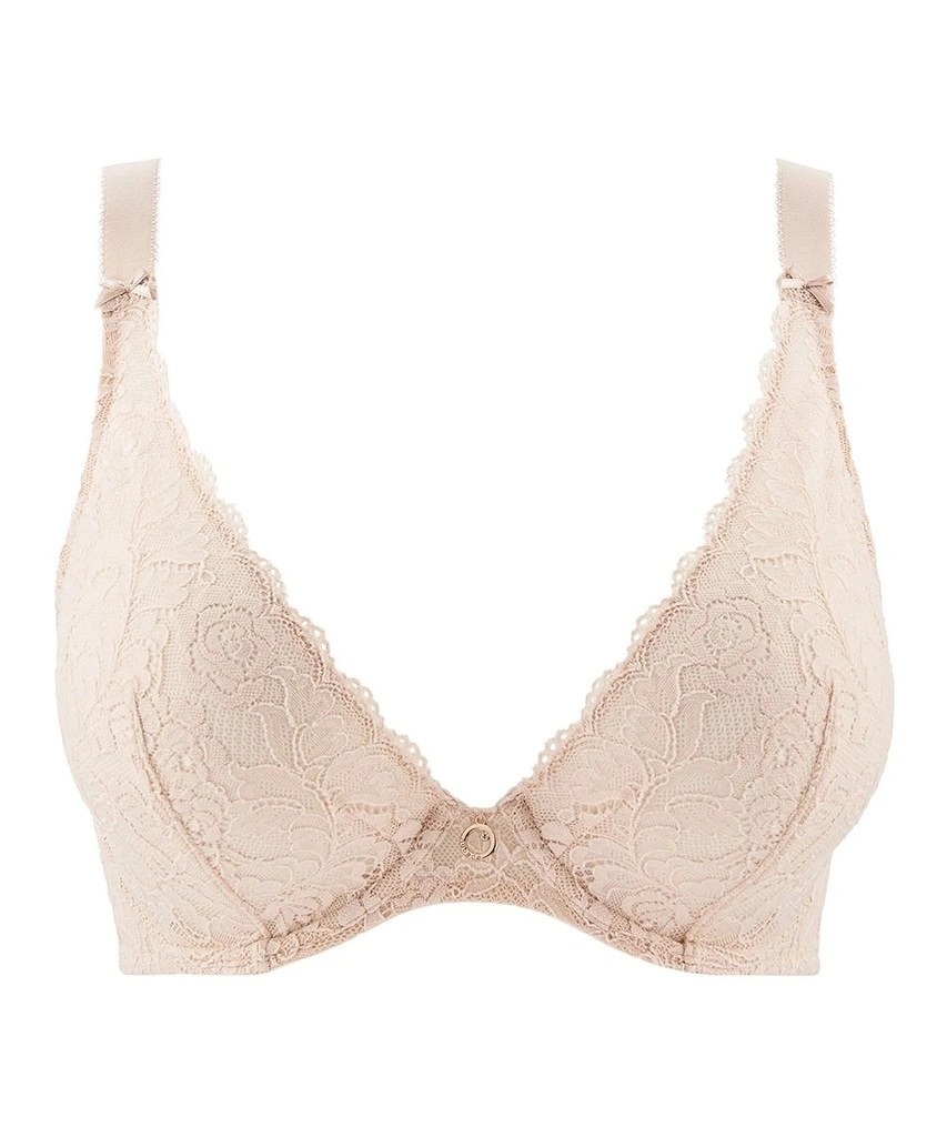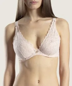Adapté aux bonnets profonds, le Triangle Plunge Confort ose confort et féminité jusqu’au bonnet F. Tout en broderies rappelant la rose d’Ispahan, il orne la poitrine de galons de dentelles délicats que l’on retrouve sur le dos du modèle. L’aisance et la féminité se marient grâce au petit bijou doré agrémenté d’un strass Swarovski à l’entre-sein.