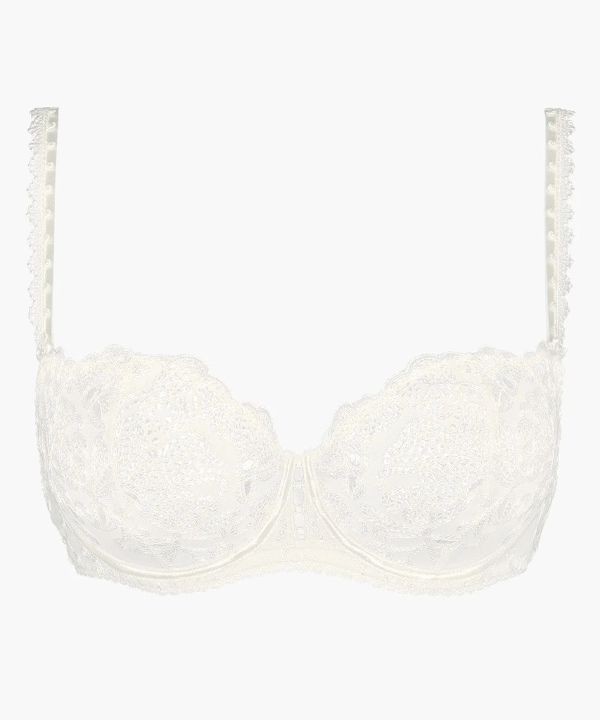 L’incontournable soutien-gorge Corbeille déploie une broderie romantique agrémentée de touches très sexy. Les bonnets aux coutures verticales sont encadrés de jolis nœuds satinés, tandis que l’entre-sein dévoile la peau sous une fine bande de guipure ajourée.