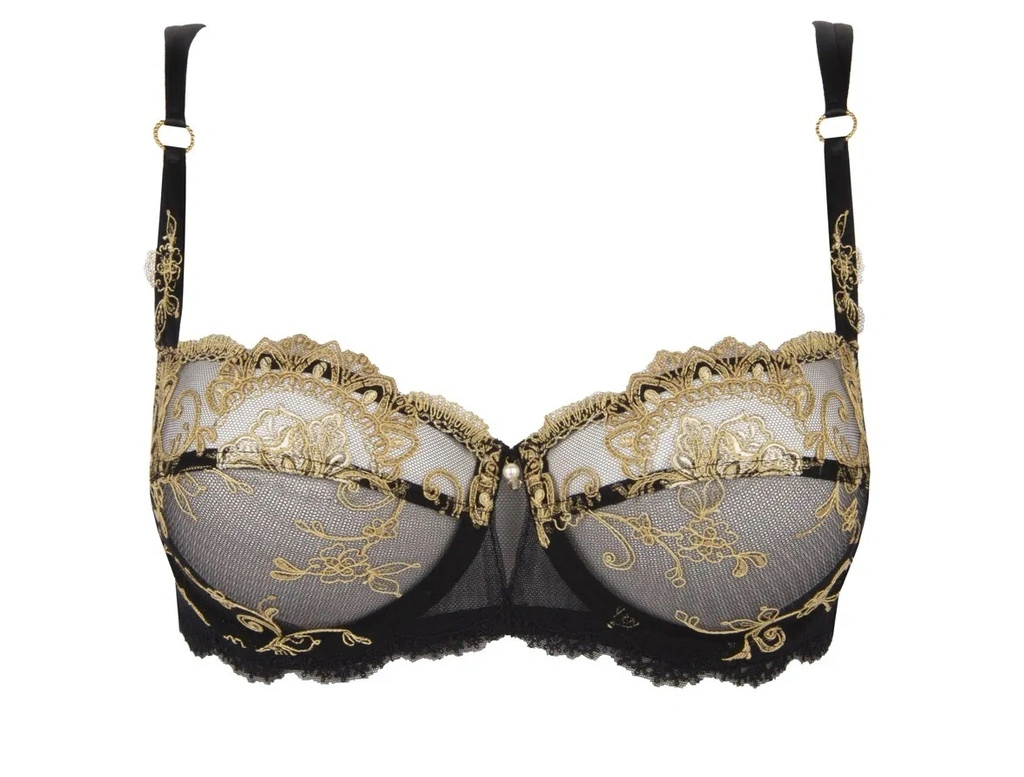 Bonnet en broderie multifils dorés sur tulle invisible, festonné au décolleté. La basque, en bande brodée festonnée noire sur le devant est enrichie d’une découpe en galon brodé festonné doré au dos. Les bretelles, en deux parties, sont agrémentées d’un motif brodé floral au départ bretelle, puis d’un anneau perlé doré. L’entre-gorge ajouré en V est sublimé par un bijou coordonné à la broderie.