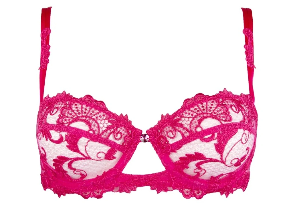 Soutien-gorge corbeille souple à armature à la découpe horizontale. Ce soutien-gorge offre un décolleté arrondi tout en féminité. Fines bretelles spaghettis réglables pour davantage de féminité et de légèreté. Empiècements de guipure effet tatoo sur les bonnets et au dos. Délicat pendentif Swarovski situé à l’entre-seins.
