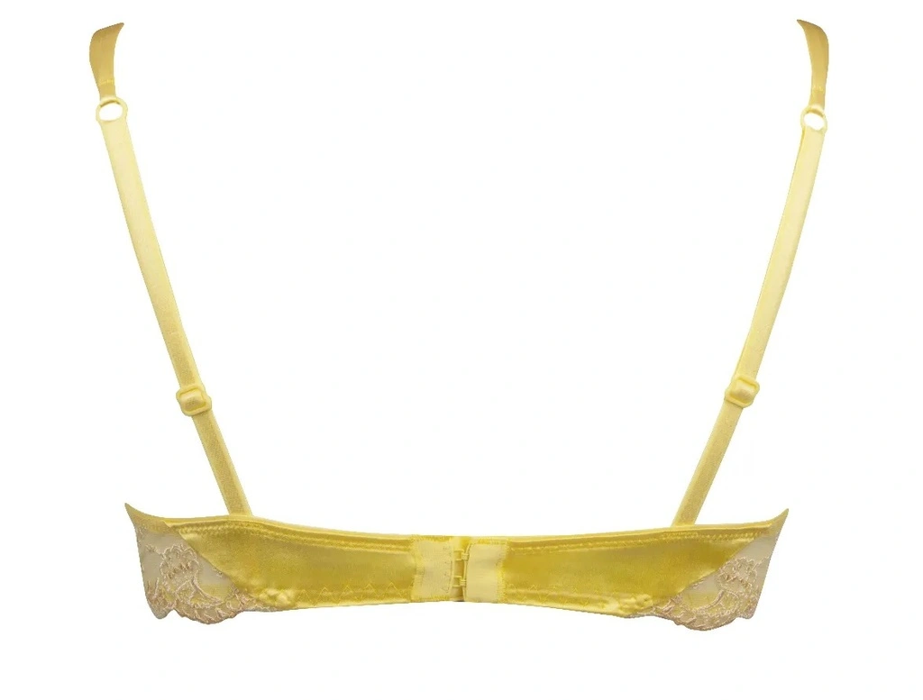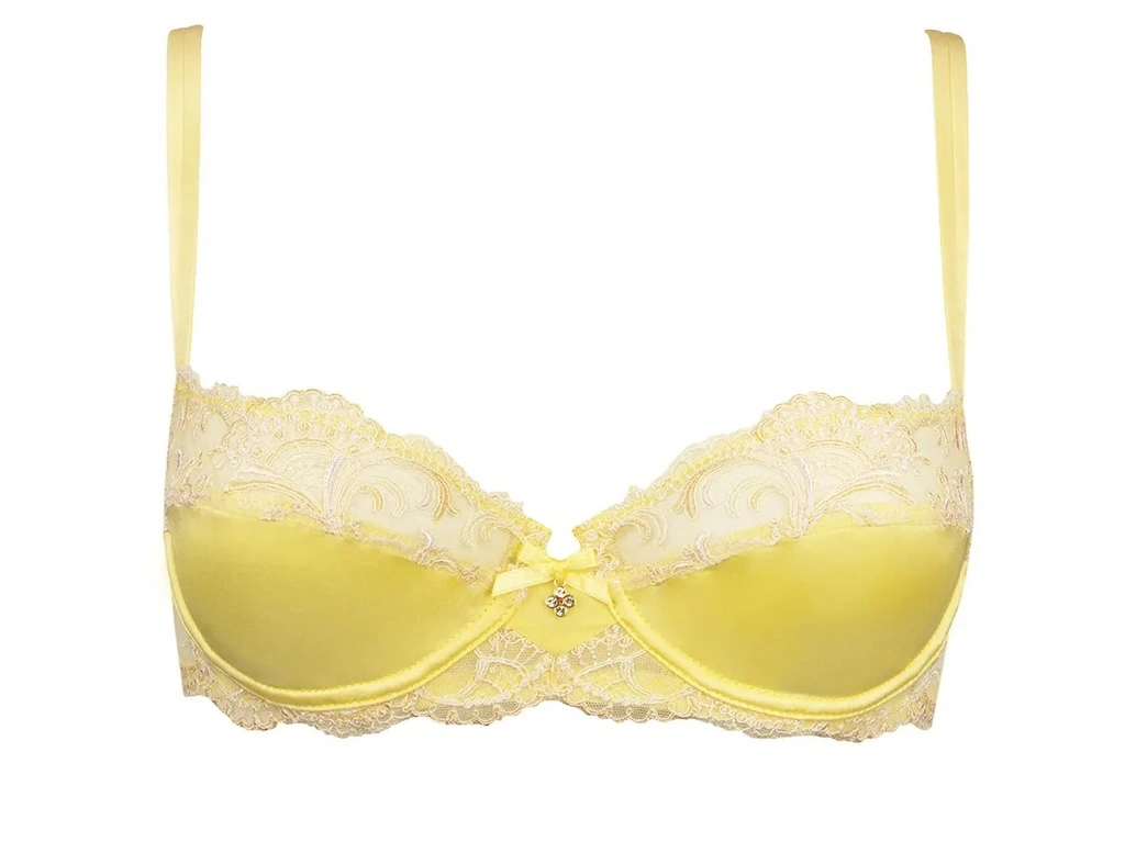 Soutien-gorge corbeille souple à armature à la découpe horizontale. Ce soutien-gorge offre un décolleté arrondi tout en féminité. Fines bretelles spaghettis réglables pour davantage de féminité et de légèreté. Délicat nœud de satin et bijou avec strass Swarovski situés à l’entre-seins.