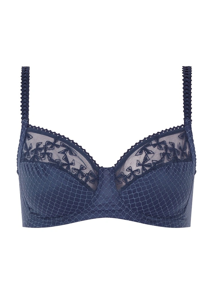 Soutien-gorge sur base. Basque centrale et latérales doublées en tulle rigide pour un maintien optimal. Haut bonnets décorés de broderie lycra fantaisie. Bas bonnets en maille opaque, doublés pour assurer un maintien total. Bordure fantaisie ultra douce le long du décolleté pour plus de féminité. Dos en tulle nerveux dans toutes les tailles. Bretelles décorées sur le devant, réglables dans le dos. 4 rangées d’agrafage. Plaque argenté siglée Chantelle.