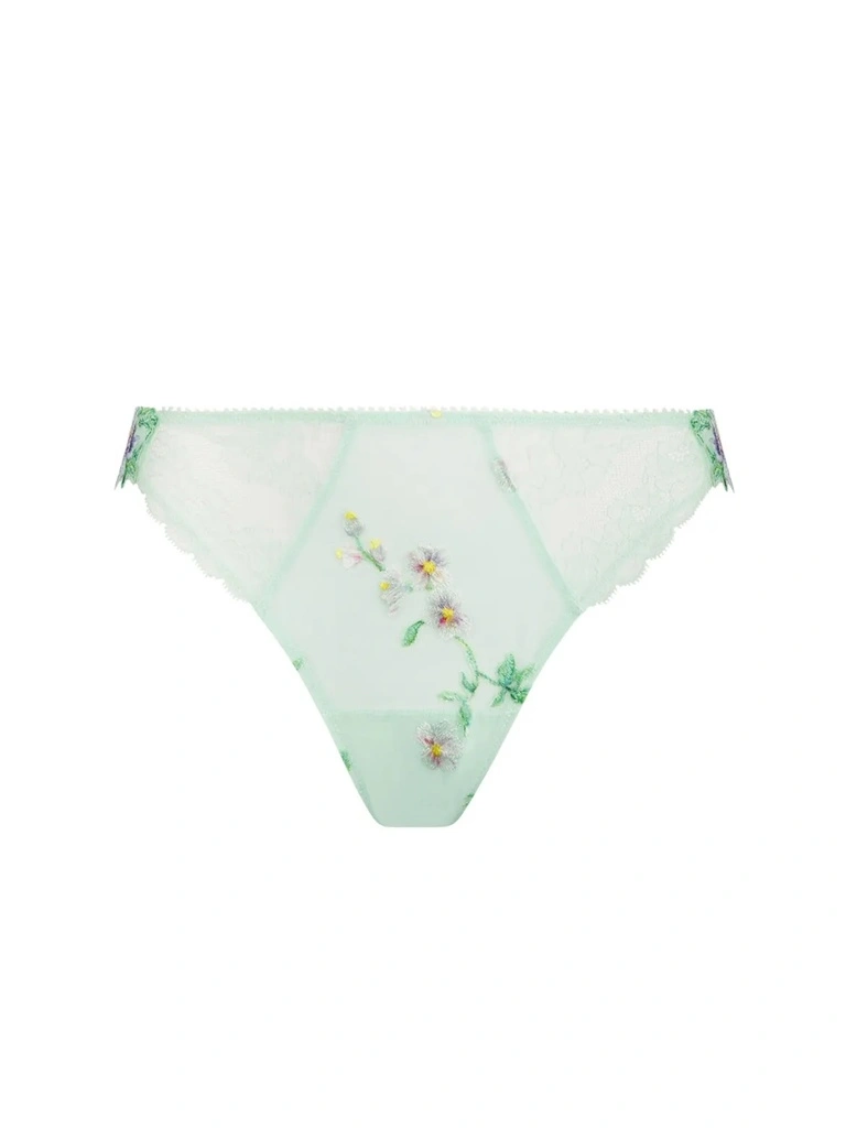Tulle brodé multicolore sur devant et dentelle festonnée en empiècements devant et taille dos. Motif floral brodé sur taille côté . Tulle et petits nœuds au dos. Elastique fantaisie à la taille.