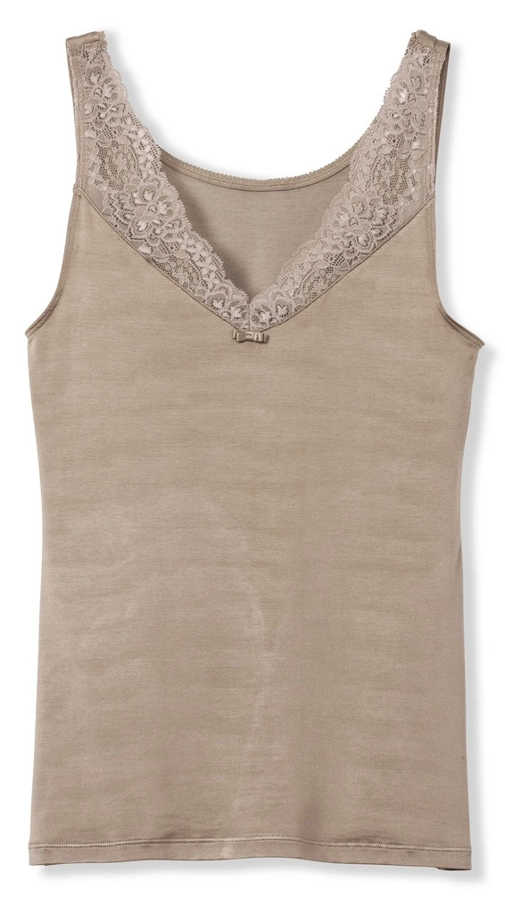 Tank top avec détail en dentelle élégant en forme de V. Grâce à l’association de trois matières, la peau est en contact avec du coton pur alors que l’extérieur est en viscose brillante. La dentelle riche et d’excellente qualité bordant avec sensualité le décolleté est particulièrement raffinée.