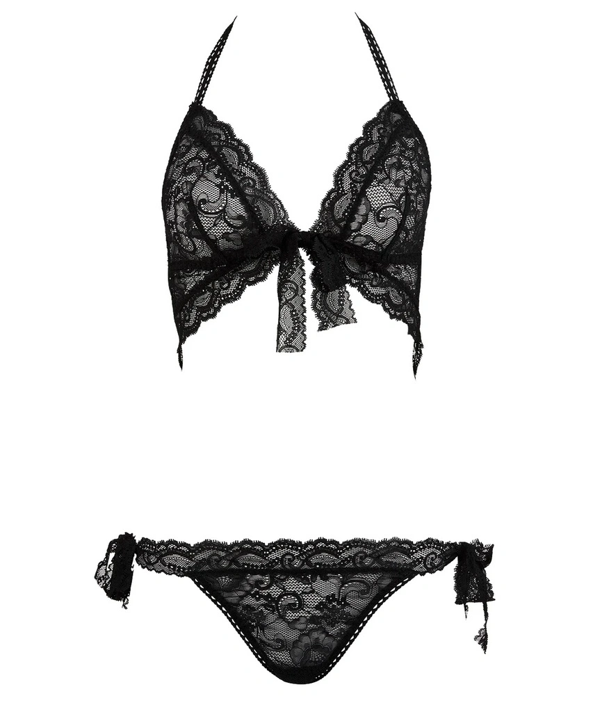 Modèle trikini très sexy se composant d’un soutien-gorge sans armature avec un agrafage simple à l’entre-seins, relié à la culotte par deux bandes de dentelle noire.